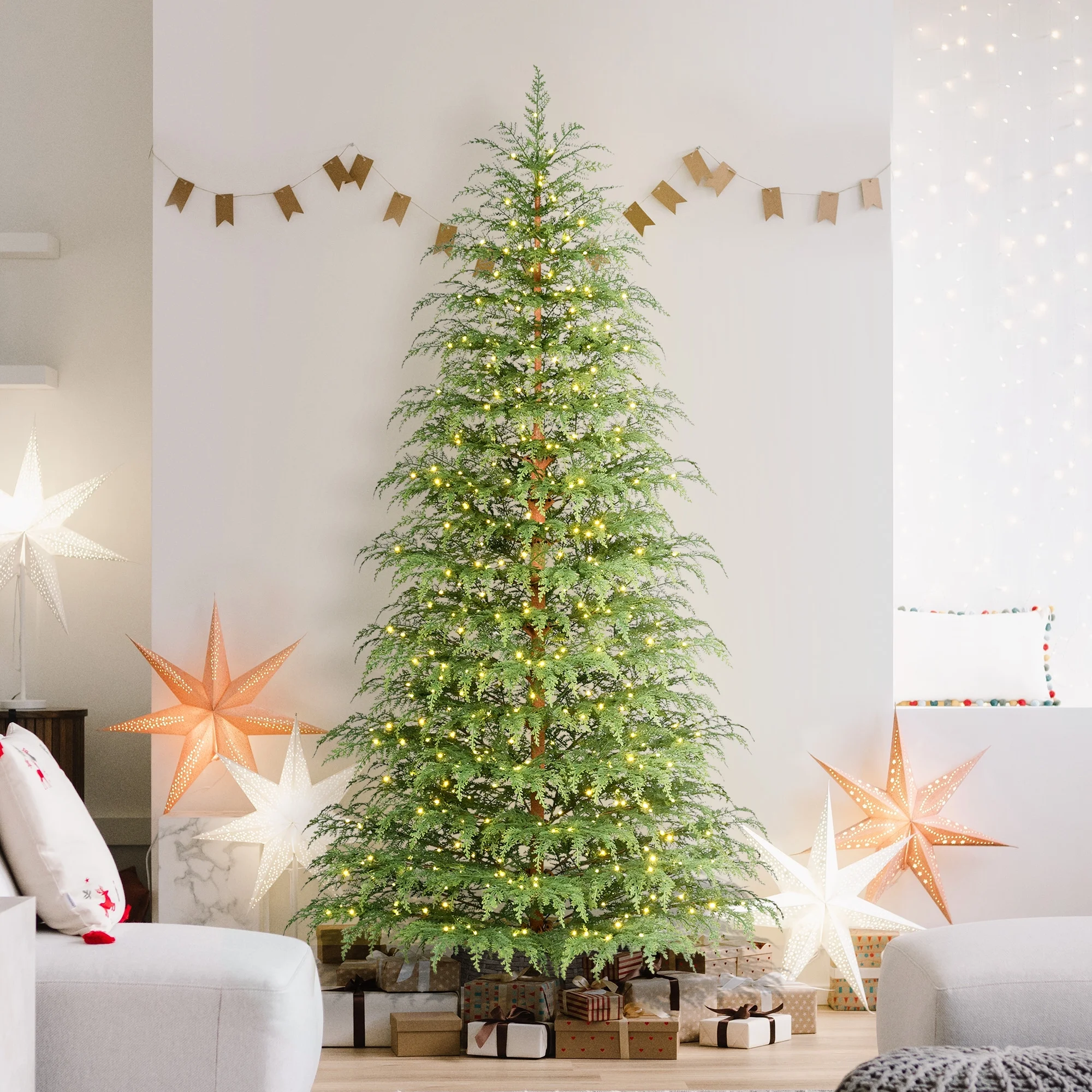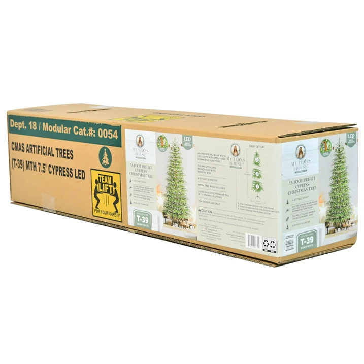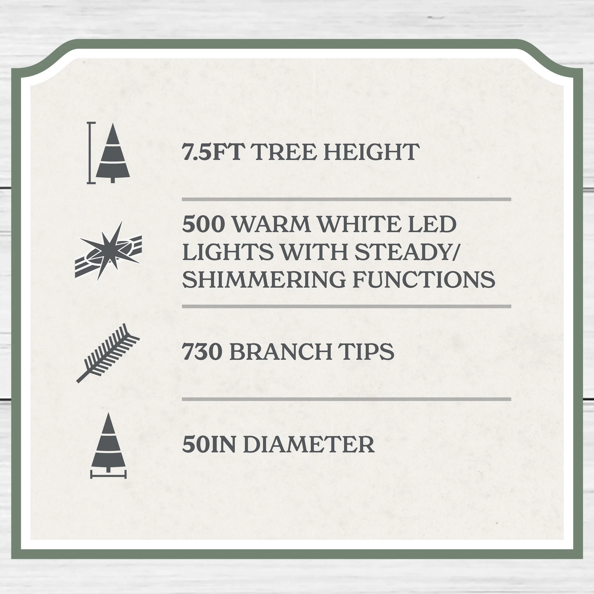 Create a bright, joyful holiday setting in any space with the My Texas House 7.5-Foot Pre-Lit Green Cypress Artificial Christmas Tree. This natural-looking, real-feel artificial cypress Christmas tree features 730 pre-attached branch tips with memory wire for minimal fluffing, all hinged for easy setup and assembly. It provides the perfect seasonal backdrop for sentimental ornaments and decorations, or it can be left as is to showcase the lively green branches and the brightness of 500 warm white LED lights with a twinkle-and-shimmering function, pre-strung to help prevent tangling. Standing 7.5 feet tall and 50 inches in diameter with a sturdy metal stand, this lively Christmas tree is perfect for medium to large rooms to get everyone in the holiday mood. The vibrant beauty of this 7.5-Foot Pre-Lit Green Cypress Artificial Christmas Tree will inspire happiness in your home for many holiday seasons to come.