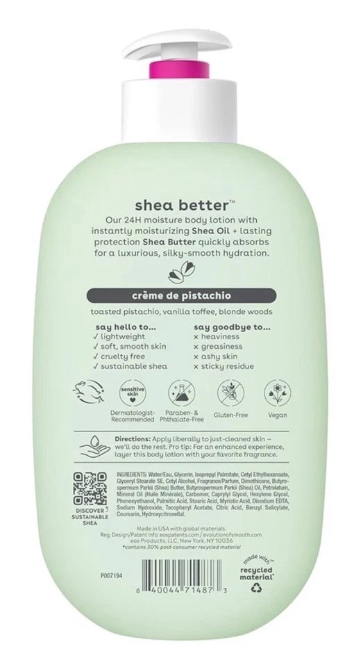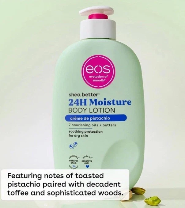 Experience soft, nourished skin all day with the EOS 24H Moisture Crème de Pistachio Body Lotion (3-Pack). This hydrating body crème is formulated to deliver 24 hours of continuous moisture with a lightweight, non-greasy texture that absorbs quickly.